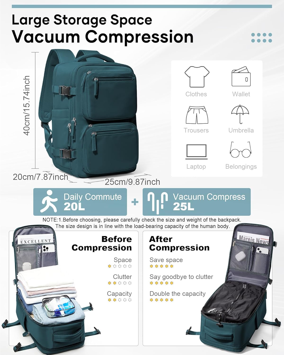 Airline Permitted: Journey backpack dimension: 40*20*25CM/15.74*7.87*9.84inches. This carry-on backpack meets the usual necessities of virtually all main airways and matches within the overhead compartment and underneath your seat. The journey laptop computer backpack unfolds 90-180 levels, permitting you to get by airport safety shortly and maintain your belongings neat and tidy. This vacuum seal backpack is ideal for weekender, journey, enterprise, faculty, climbing, tenting, each day use and different out of doors actions.