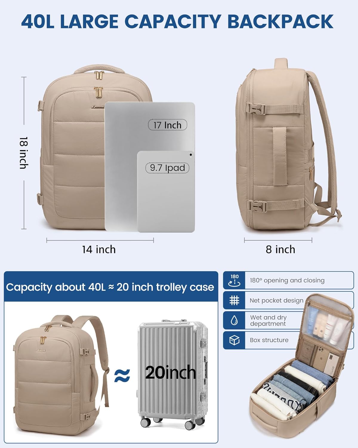 【Airline Accredited &TSA Pleasant Design】Measures 18x14x8 inches, assembly most airways’ necessities. It matches beneath seats or in overhead compartments and opens 0 to 180 levels for fast safety checks, making it an excellent private merchandise for air journey.