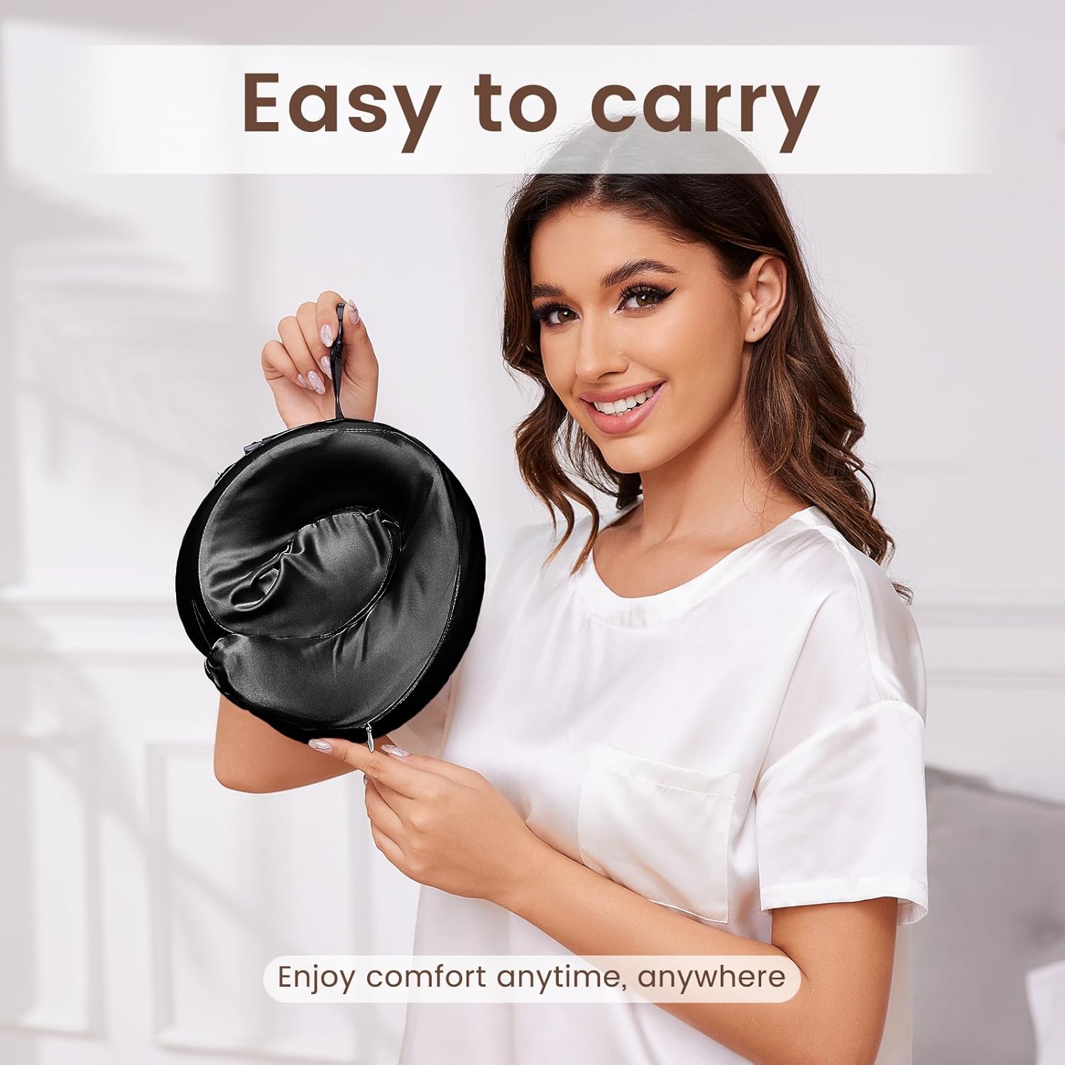 THXSILK 100% Mulberry Silk Neck Pillow for Traveling, Pure Memory Foam Travel Pillow for Airplanes, Travel Neck Pillow for Sleeping, Head and Neck Support, Neck Pillow with Storage Bag (Black)